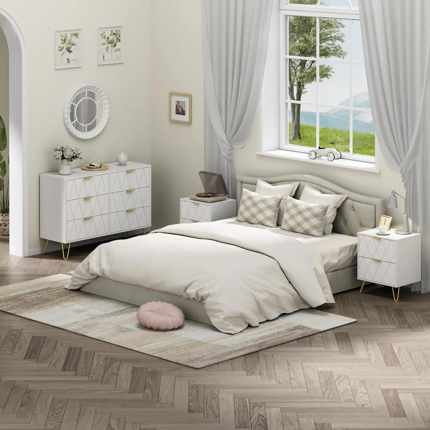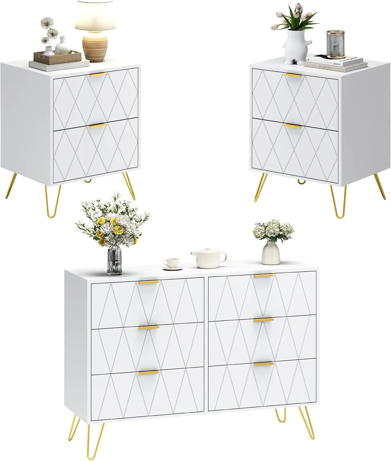 3 Pcs Bedroom Sets, 6 Drawer Dresser and Night Stand Sets for Bedroom, Two Drawers Nightstand Set of 2 & 6 Drawer Dresser Combo 3 Pieces (White)