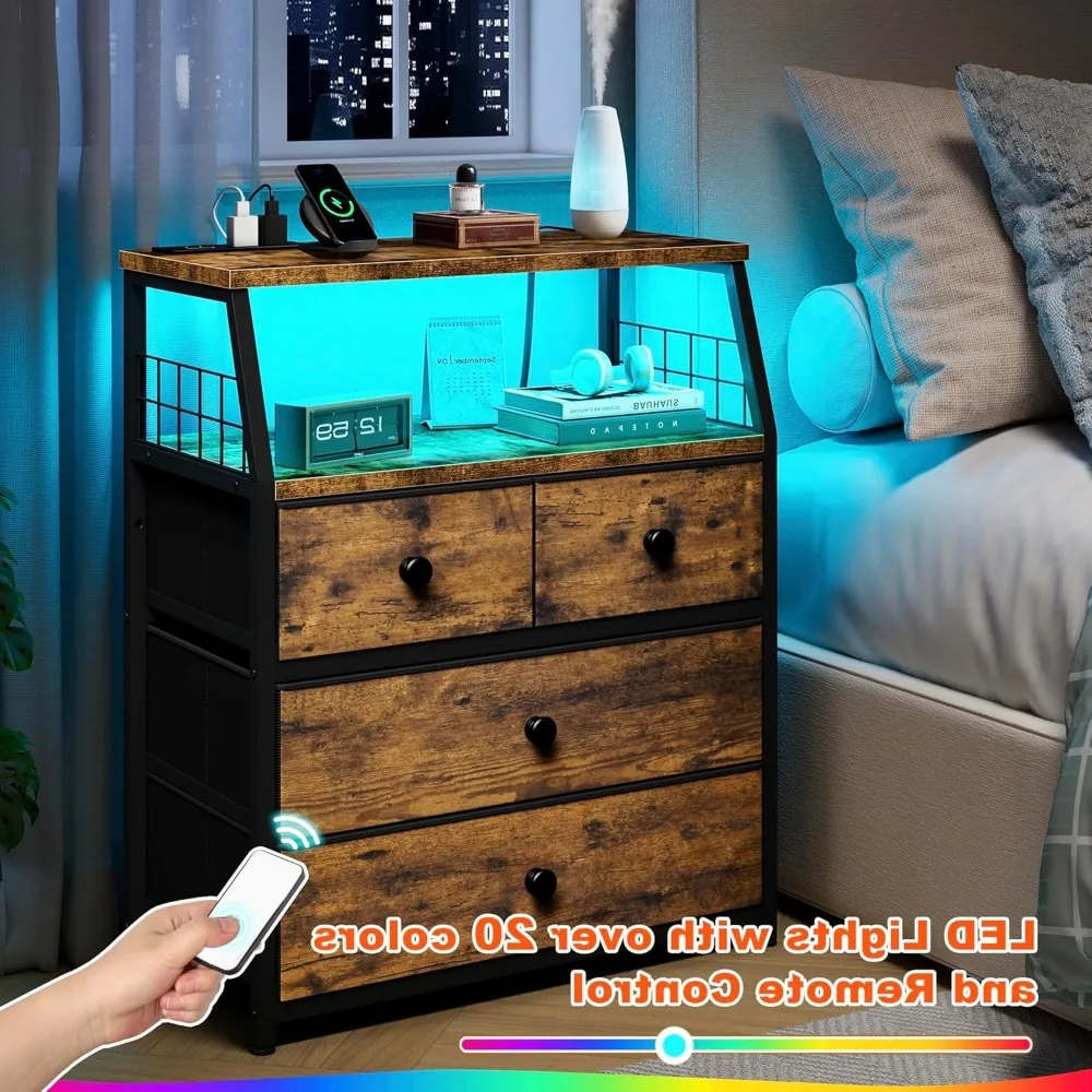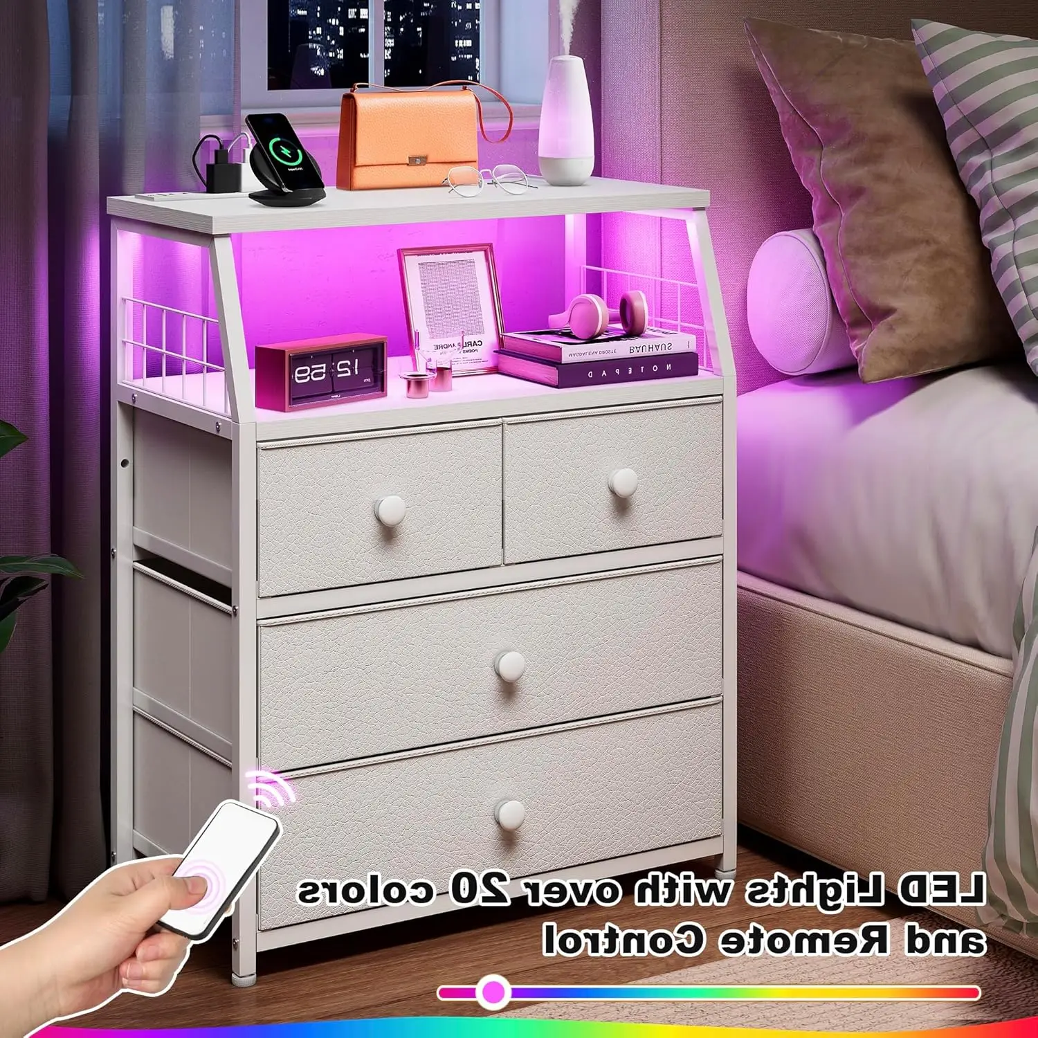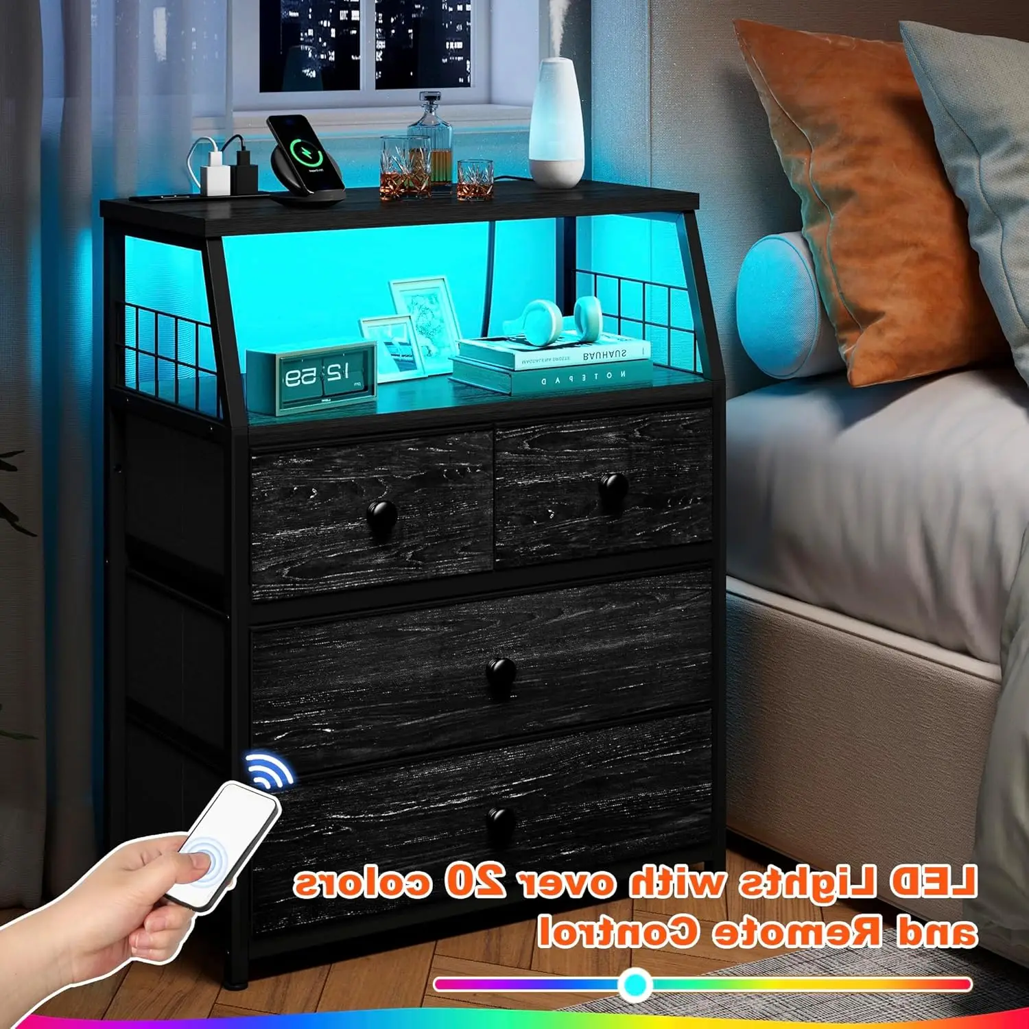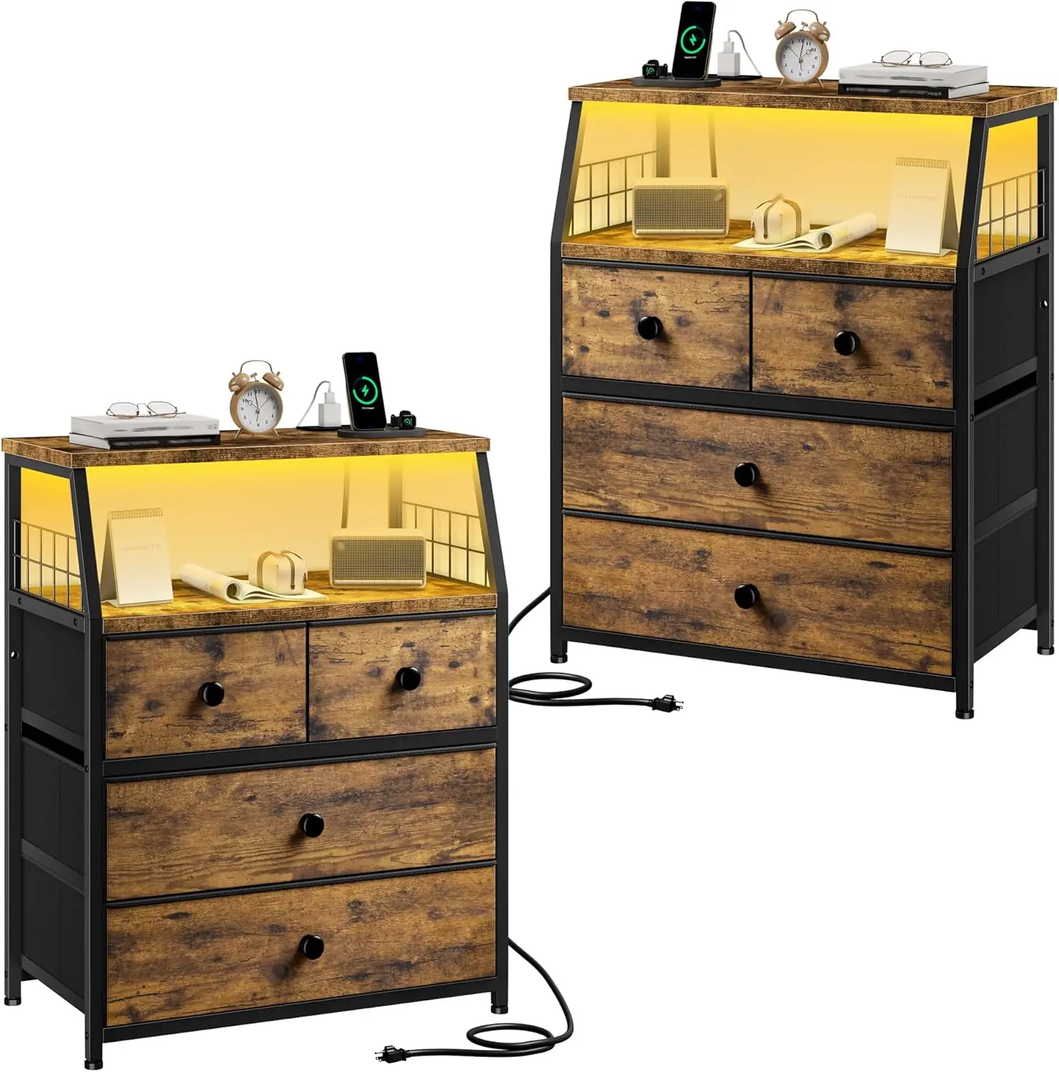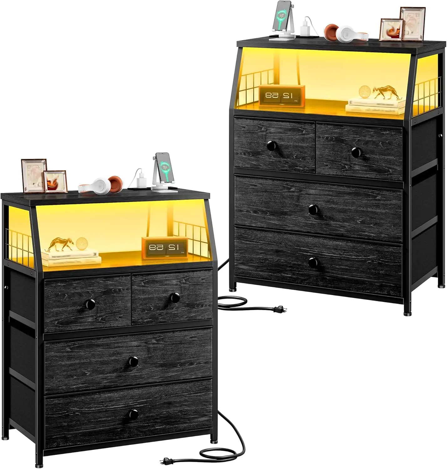Nightstand Set of 2, Night Stand with Charging Station & LED Lights, Bedside Table with 4 Fabric Drawers for Bedroom