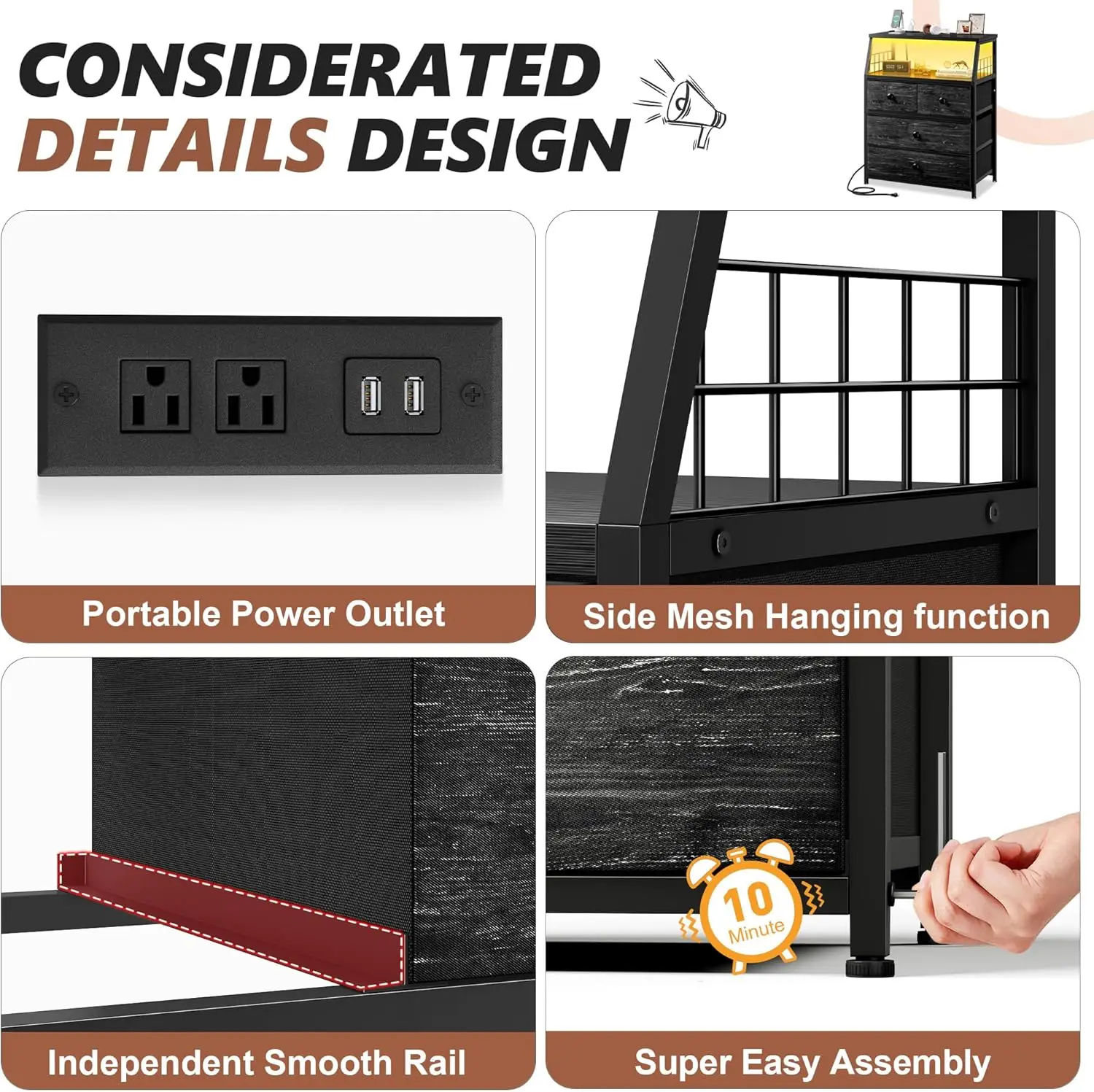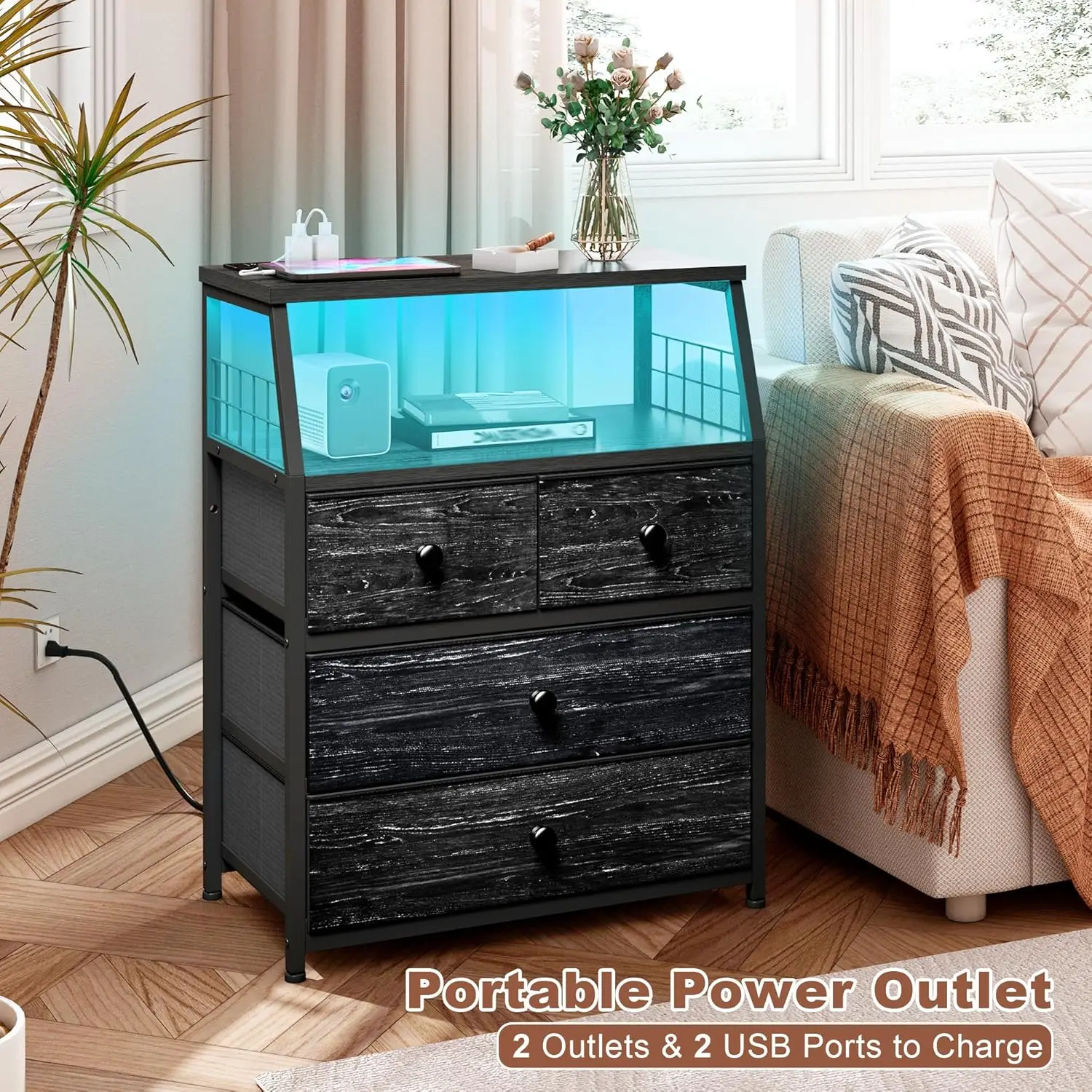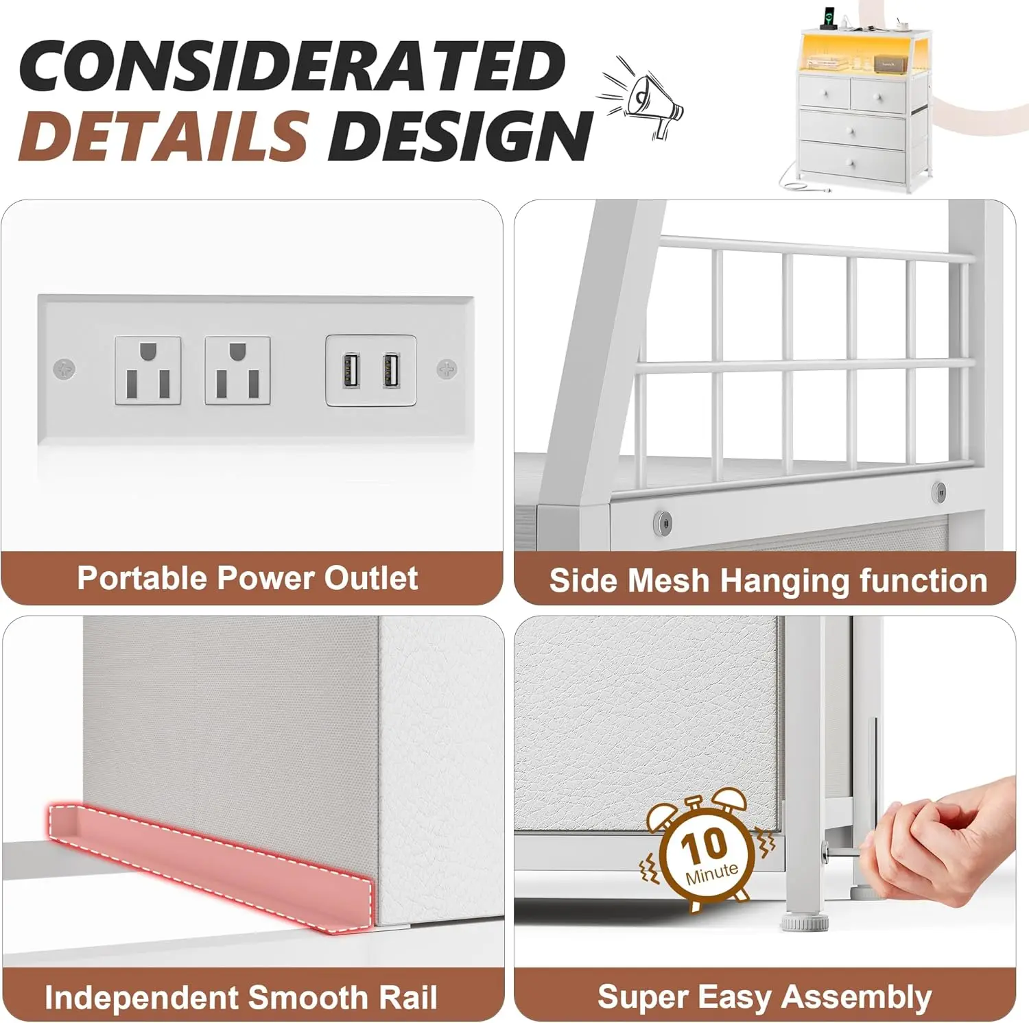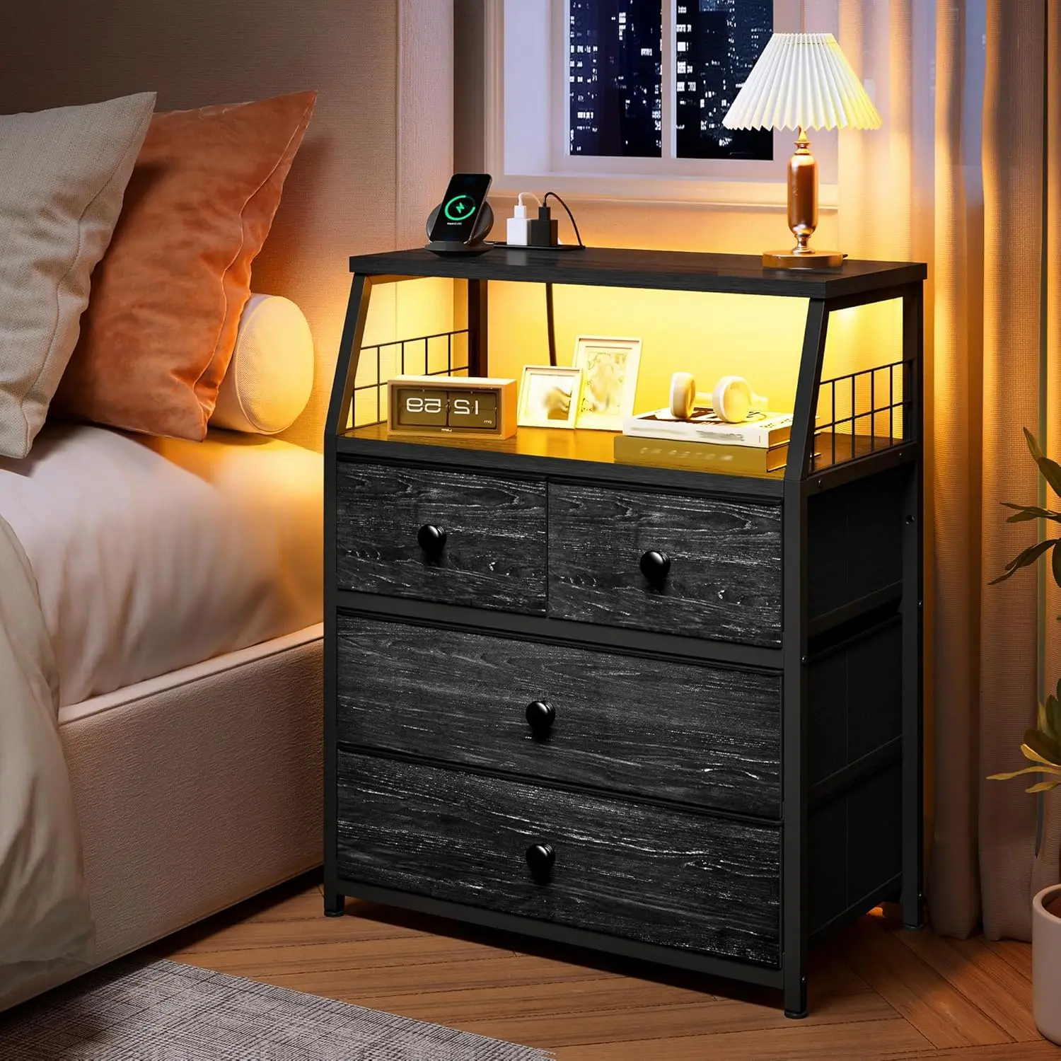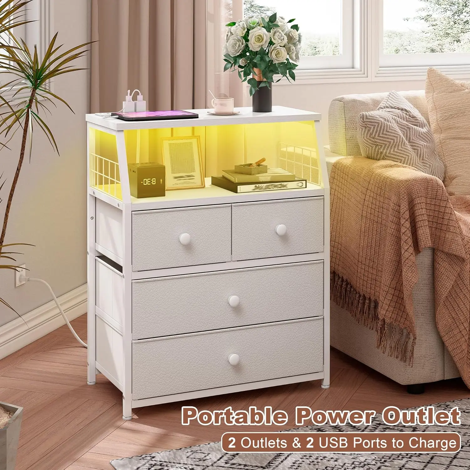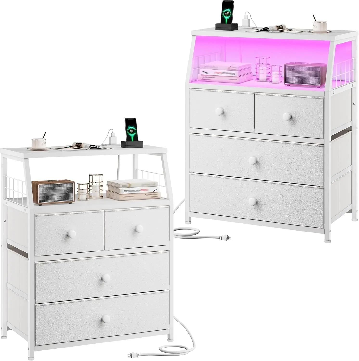 Nightstand Set of 2, Night Stand with Charging Station & LED Lights, Bedside Table with 4 Fabric Drawers for Bedroom