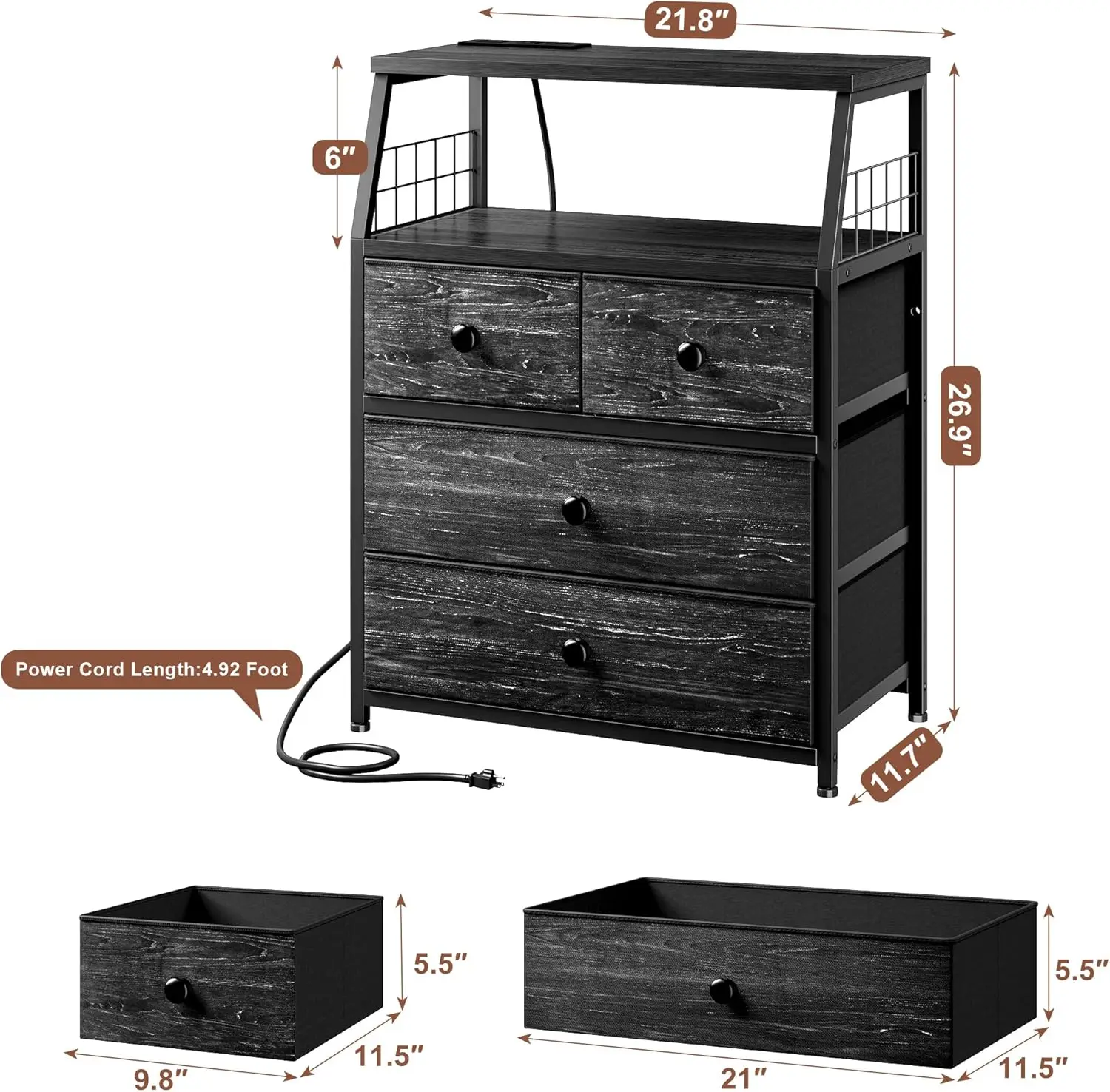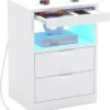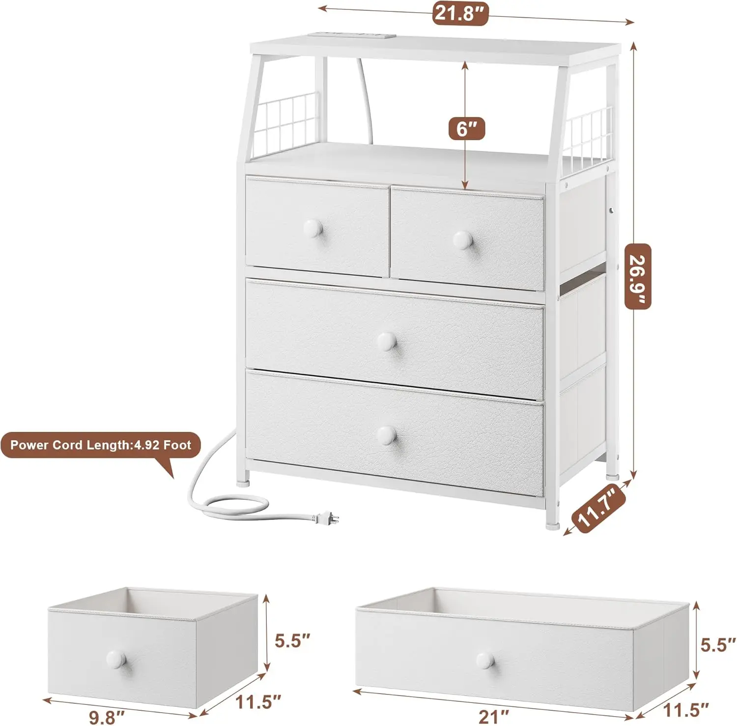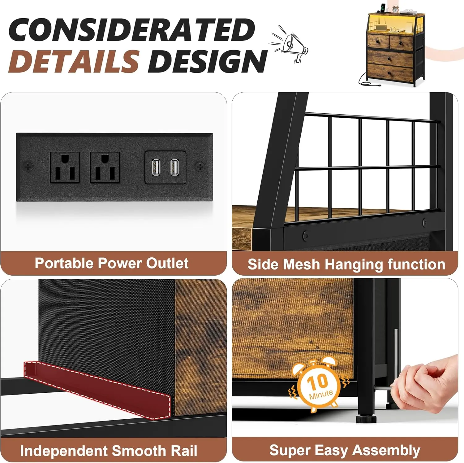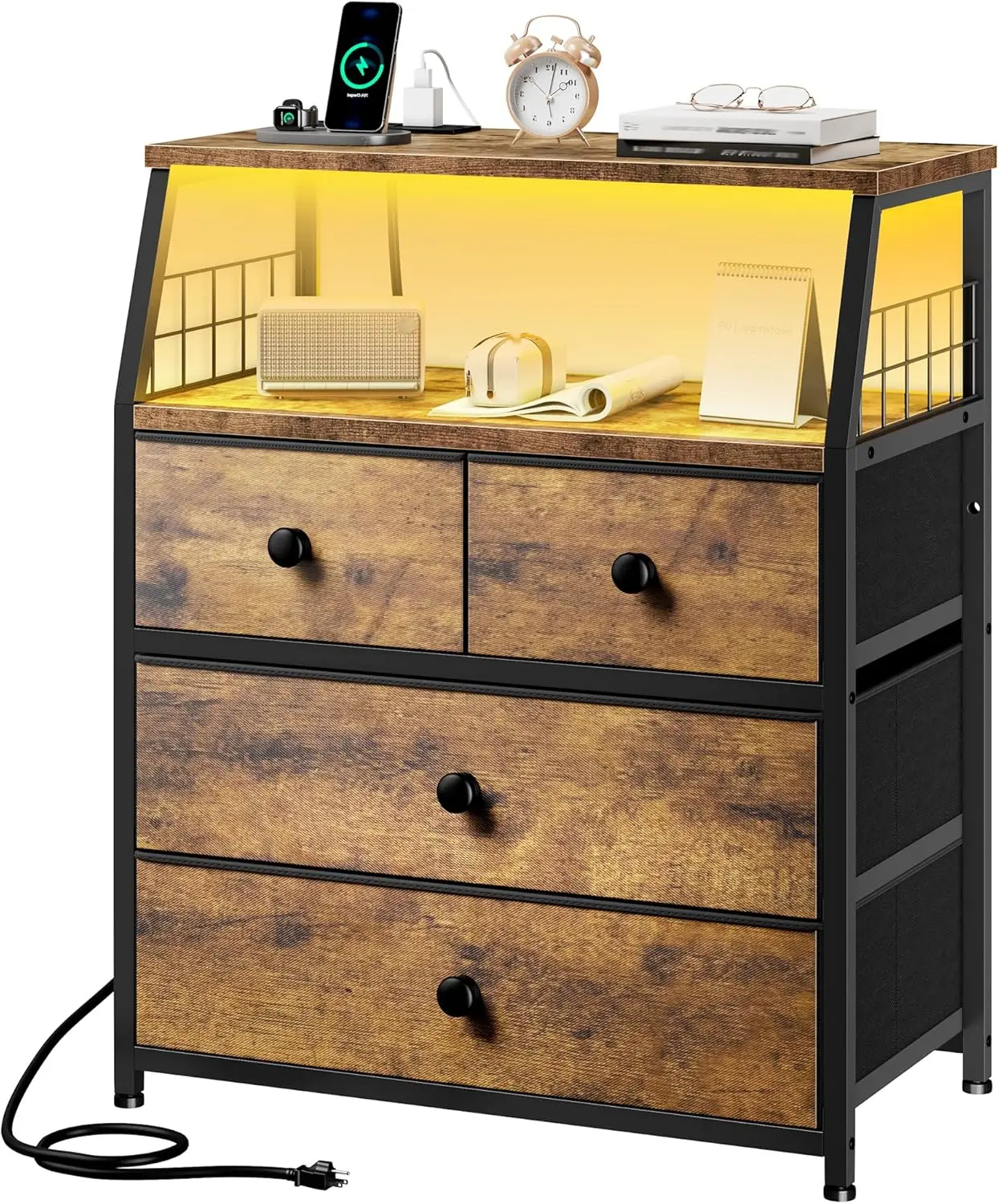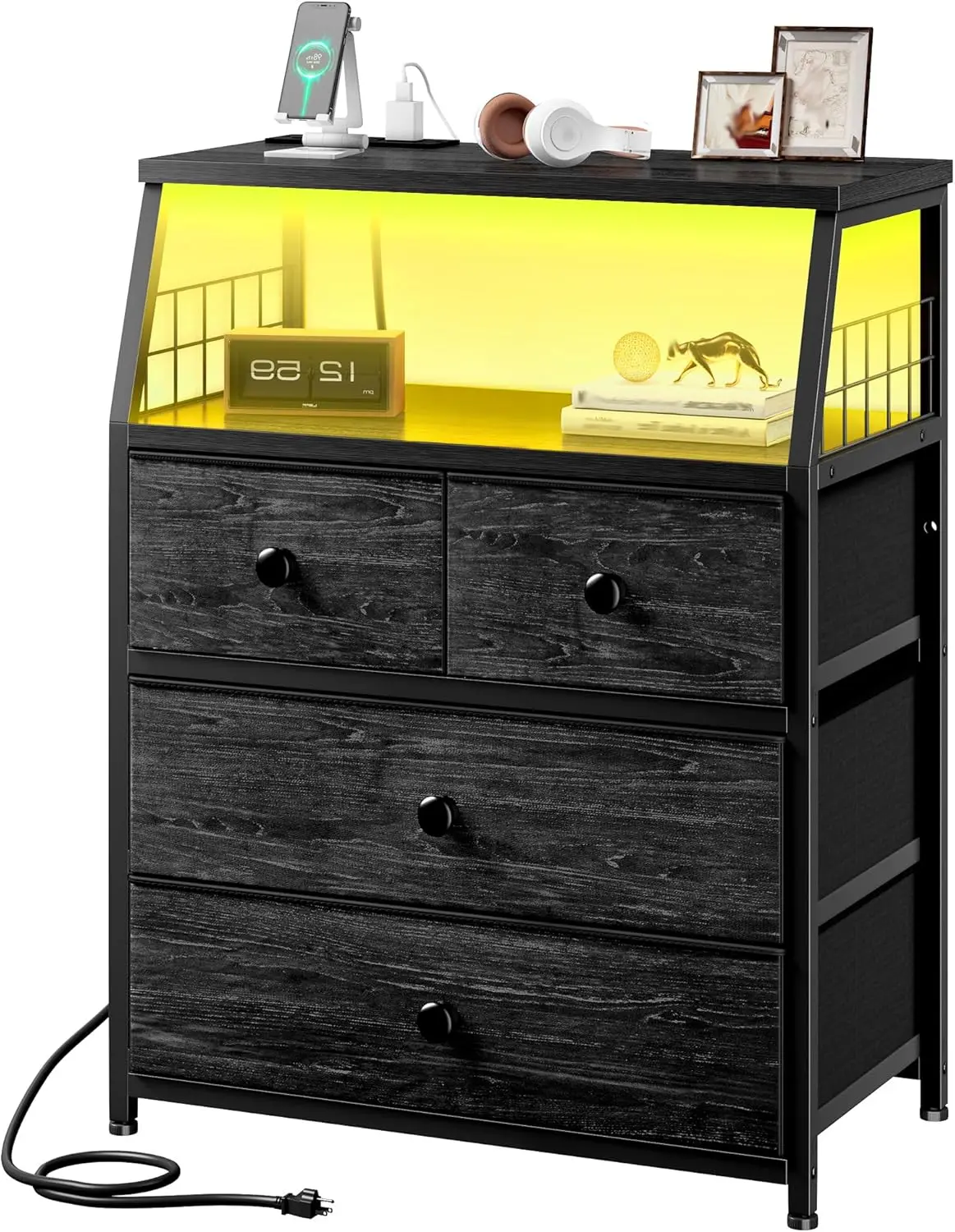 Nightstand Set of 2, Night Stand with Charging Station & LED Lights, Bedside Table with 4 Fabric Drawers for Bedroom
