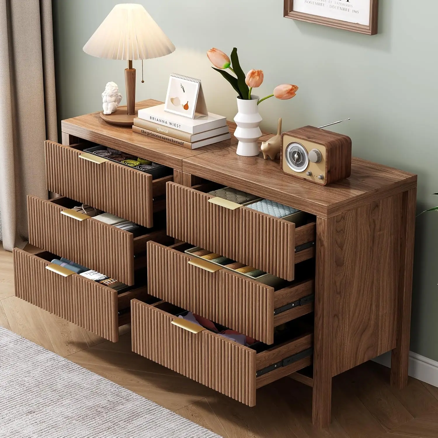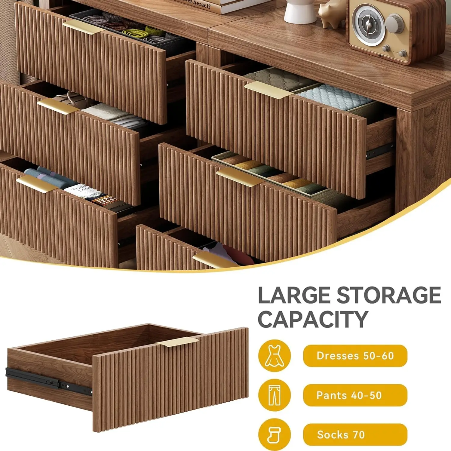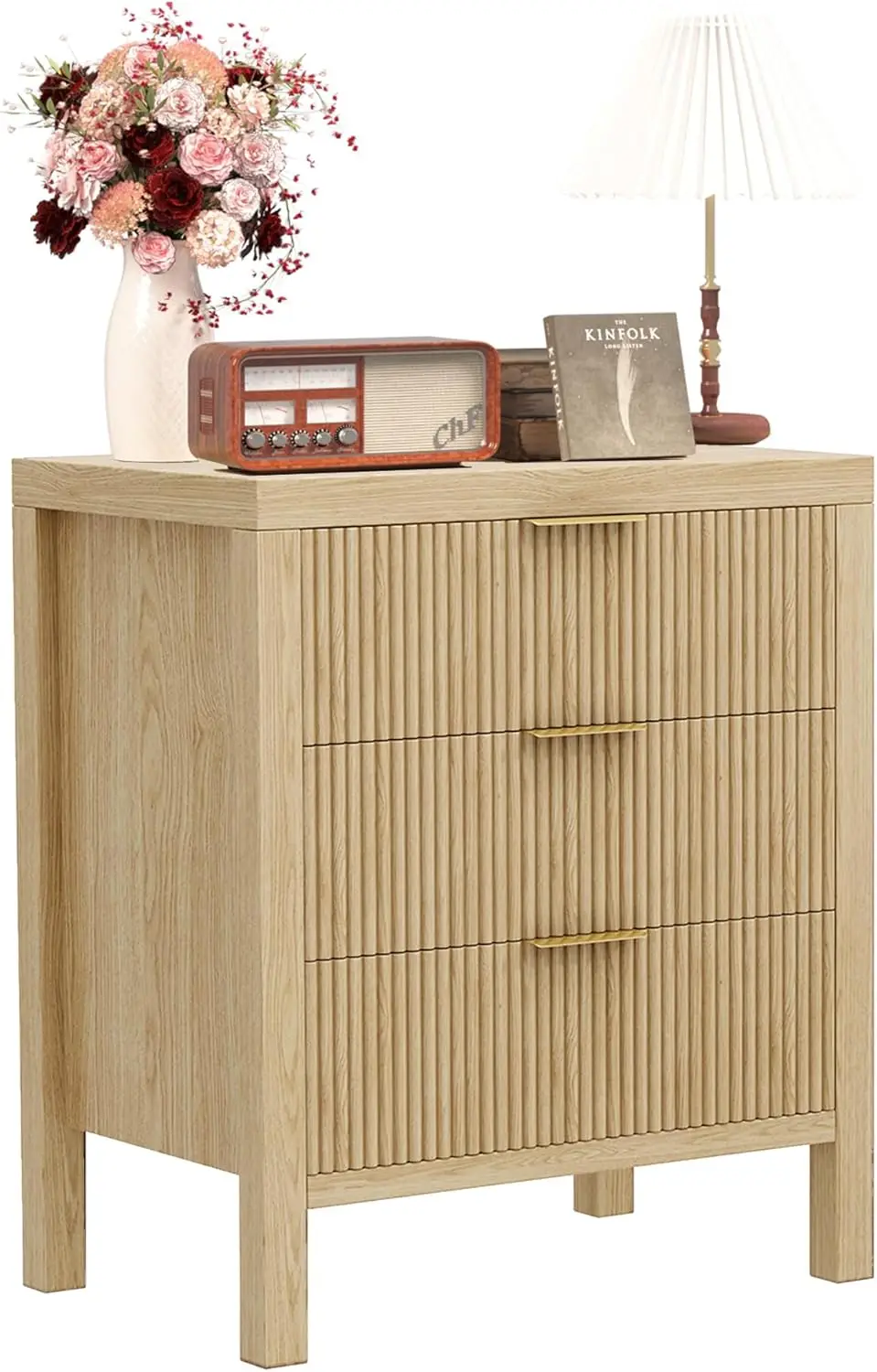 - Timeless Elegance Meets Modern Chic: The distinctive waveform fluted panel enhances the texture and spatial presence of this exceptional piece, making this side table suit many home decor, luxurious gold metal pull handles add appealing detail to this modern dresser.